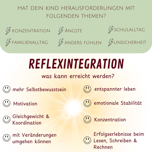 Die Reflexintegration zielt darauf ab, nicht vollständig integrierte frühkindliche Reflexe durch spezielle Übungen zu harmonisieren. Diese Reflexe, die normalerweise in den ersten Lebensjahren integriert werden sollten, können bei Nichtintegration zu verschiedenen Schwierigkeiten im Alltag führen. -